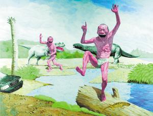 将“玩世”这一主题借助于画笔形象化地表现出来,方力钧刻画了一群悬置半空打呵欠,或者浮在水面无所事事的人物形象;刘炜创造了一些疙疙瘩瘩、歪歪扭扭、傻乎乎的面部表情;而岳敏君则塑造了一种与众不同的笑。关于笑,岳敏君有自己独到的见解。他说人在笑的时候最空洞。所以,他重复地画笑,就是想反映这个时代的精神空虚。