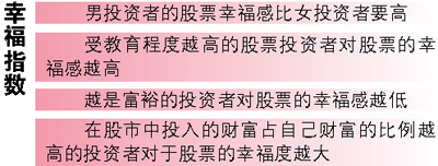 本报讯 (记者吴倩)每当股市风起云涌,股民的心潮也随着股市而翻腾。然而,在一样的股市浪潮中,股民所能获得的炒股幸福感却大有不同。基于历时60个交易日的问卷调查,“海富通-上海交大投资者教育研究中心”专家组进行的一项研究显示,股票幸福感取决于大盘的变化而不是指数的高低;男性投资者的股票幸福感更强。