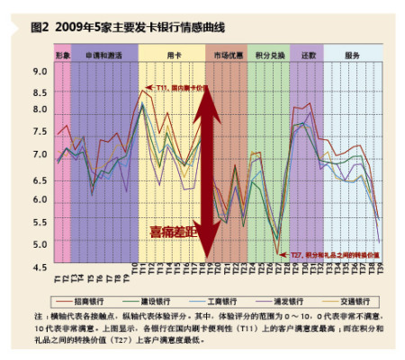图2是2009年招商银行、建设银行、工商银行、浦发银行和交通银行这5家主要发卡银行的情感曲线。之所以选择这5家银行,是因为在调查时得到的关于它们的反馈数据是最多的。这些情感曲线涵盖了信用卡客户的整个客户生命周期,包括从品牌及企业形象(T1~T2体验接触点),到申请和激活(T3~T10)、用卡(T11~T18)、市场优惠(T19~T23)、积分兑换(T24~T28)、还款(T29~T32),最后到服务(T33~T39)等7个环节,覆盖了大部分客户体验的主要接触点。根据客户在不同接触点上的体验评分,得到了各银行不同的情感曲线。