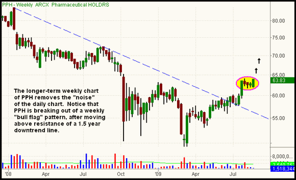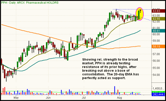 在市场最近的短期回调过程中,生物科技和制药板块一直表现出相对强势。我们已经持有iShares Nasdaq Biotech(IBB),但我们也喜欢Pharmaceutical HOLDR(PPH)的形态,它即将突破数周来的整理带。下面是它的日线图: