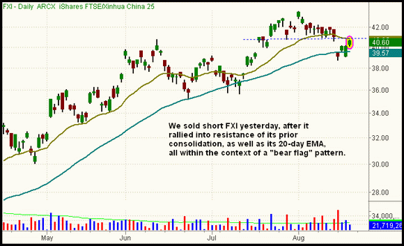 昨天我们建立了一个卖空iShares China Xinhua 25(FXI)的新头寸,过去几天来我们一直在等待这一机会。尽管FXI仍高于50日均线,但它已经来到了前期支撑带被突破后形成的新阻力位和20日均线的阻力位。而且现在FXI还处于一个“熊旗”形态之中,意味着未来几天可能会再次下跌。下面是FXI的日线图: