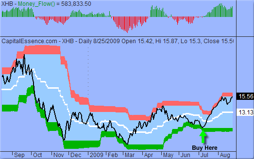 事实上,在我们7月9日提出“资金流向指标的看涨背离预示着可能出现轧空行情”之后没过多久,XHB就强力向上突破,并在不到两个月的时间里飙升大约45%。