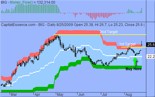 如图所示,经过周二的暴涨之后,BIG突破了短期交易区间。这是一个危险信号。另外,昨天看跌的“流星”烛线也强烈表明供给压倒性地战胜需求。因此我们预计今天该股将会测试向上跳空缺口的支撑。不过资金流向指标依然正面,发出吸筹信号,因此我们相信任何下跌都将是买入的机会,而非锁定收益和离场的时机。紧邻支撑位大约在24美元,即昨天的向上跳空缺口处。收盘跌破这一位置将意味着进入短期回调行情,下方目标为22.20美元,即上图白线的位置。