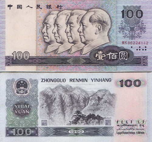 第四套人民币100元,1988.5.10发行 毛泽东侧面头像固定水印1992.8.20开始发行1990年版,该版在钞纸中增加了一条固定的金属安全线,并增加了用无色荧光油墨印制的表示面额的汉语拼音和阿拉伯数字字样。正面是四大伟人头像,浮雕系司徒兆光先生创作,中央美院侯一民教授绘画,雕刻家苏席华精心雕刻成人民币凹版,十分精美。