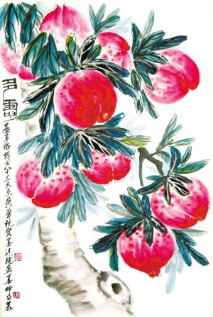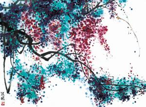 娄述德从艺术一路走来,不断地走过几许里程。我们发现他的画在齐派大的格调中,有他独特的探索与发展。在奋力追求从传统中求发展,在造化的感应中有自己的心得体会,从而发之于笔墨。《春光》完全是传统的技法,而《藤萝》却有大的变革,他用碎玉般的彩色点子与墨色藤子的交织,同样表现了春光的绚丽。但这件作品采取的是以貌取神的手法,营造出虚灵幻象的境界,应属大胆的艺术探索。另一幅《螃蟹》,画中题句是“拟齐白石先生笔意”,我觉得倒有些他自己的东西,发展多于守恒,正是拟笔意,并非忠实临摹也。我感觉,用笔的轻快自如,五只螃蟹的位置参差,以及墨色浓淡详略,都处理得非常好,似在不经意间完成一幅佳作,动感强烈,极为生动,是齐派家法却又有述德个人独到的情趣与新创。