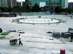 昨天,西单文化广场主体工程完工。据介绍,改造后广场中央是大型广场喷泉,铺设淡灰色地砖,预计9月初交付使用。孙妍 摄 J222
