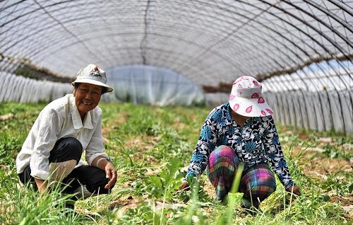 内蒙古准格尔旗的两位农民在实施微灌技术的大棚内劳动(7月27日摄)。新华社记者 李欣 摄