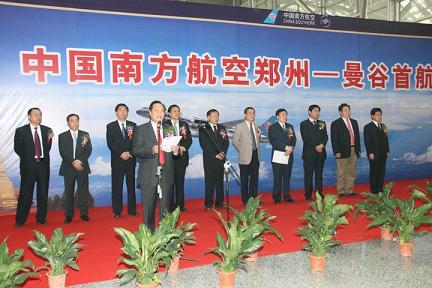 10月27日下午16:30时,随着中国南方航空集团公司(简称南航)波音737-800型5163号飞机从郑州机场腾空而起,标志着南航郑州至曼谷首条直飞国际定期航班的正式开通,这不但填补了河南通往东南亚国家的直飞定期航班空白,而且预示着南航落实与河南省政府签署的《战略合作协议》上升到了一个新的高度。