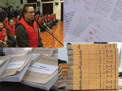 图片02:黎强这起涉黑团伙案涉及到的被告人多达31人,案卷达到了240多本,公诉人用了整整3个大旅行箱来装这些卷宗,黎强一案创下了重庆打黑审判的多个第一,案卷数最多、庭审时间最长、被告人数最多。