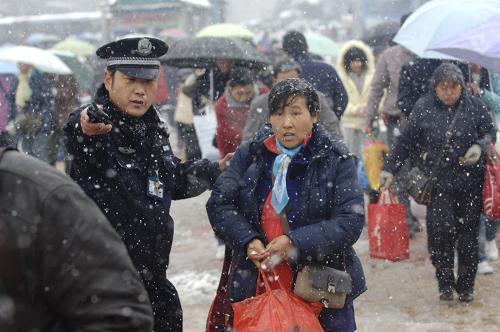 11月16日,合肥火车站派出所一位民警在引导旅客进站候车。从11月15日晚起,安徽大部普降大雪,局部地区出现暴雪。11月16日,安徽合肥仍持续大到暴雪,造成部分客运班车停运,合肥骆岗机场被迫关闭。目前,铁路、交通、环卫等部门正积极行动,做好除雪工作。新华社记者 李健 摄
