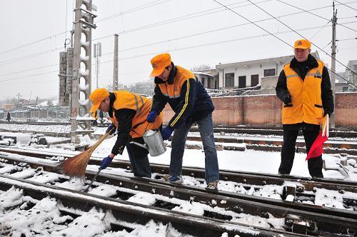 11月16日,铁路职工在西安西站编组场清扫积雪。 连日来,陕西省大部分地区遭遇强降雪天气,西安铁路局全面启动暴风雨雪恶劣天气应急预案,数万名干部职工日夜奋战在铁道线上,确保铁路大动脉的安全畅通。新华社发(唐振江 摄)