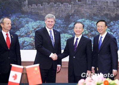 中国日报网环球在线消息:记者从加拿大驻华使馆获悉,正在北京访问的加拿大总理斯蒂芬·哈珀12月3日宣布,加拿大已与中国签署了两项协定,这将促进双方在气候变化和文化领域的更大合作。加拿大总理和中国国务院总理温家宝在北京人民大会堂见证了这两项协定的签署。