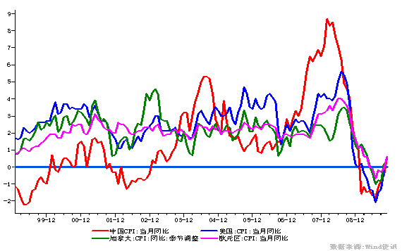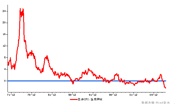 在全球经济复苏预期的背景下,全球主要股市在2009年表现尤其夺目,唯独日本缺席了这次盛宴,12月11日,日经指数收于10107.87点,较年初的8991.00点仅上涨1116.87点,涨幅为12.42%,股市是经济的晴雨表,显然日本的经济复苏落后于其它主要经济体,同时,日本的消费者物价指数已回落到20世纪70年代以来的最低点,且新低不断(如图一)所示,目前日本经济正面临着严重的通缩。故12月8日日本政府公布了新经济刺激方案,内含7.2万亿日元支出。