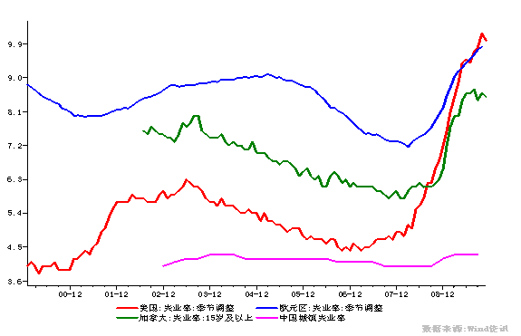 余下的四个经济体中,从GDP环比数据看,只有中国实现连续两个季度增长,其余皆为一个季度;从CPI数据看,四个经济体都刚转正或即将转正(如图七所示);从失业率看,美国、欧盟和加拿大的失业率都在历史高点徘徊(如图八所示,同时由于中国国家统计局提供的是城镇失业率,故未将之与其余进行对比分析),综合以上三点,我们认为这四个经济体加息时间较为接近。