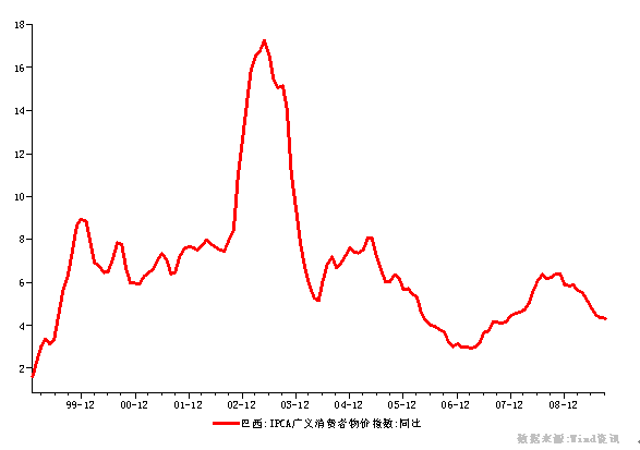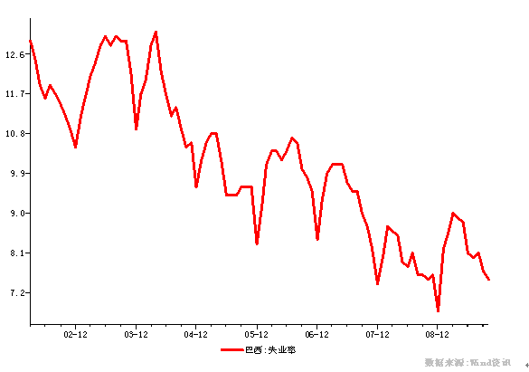 与澳大利亚一样,巴西也是一个矿产资源十分丰富的国家。金融危机对巴西经济的冲击较小,目前,巴西GDP已经连续两个季度环比增长了,消费者物价指数也没有像其他经济体一样急剧下滑,如图四所示,尤为关键的是在其他经济体为失业问题头痛不止的时候,巴西失业率却保持在历史的低位(如图五所示),这给了巴西央行较大的货币政策操作空间,我们认为巴西将接印度之后成为第二个加息的国家。