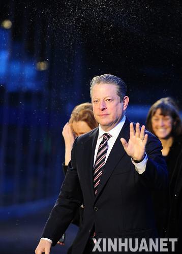 12月18日,在丹麦首都哥本哈根,美国前副总统戈尔(前)抵达会场。当天,联合国气候变化大会领导人会议在丹麦首都哥本哈根举行。新华社记者曾毅摄