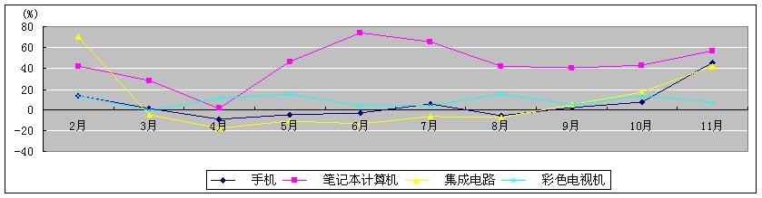 四、产品产量回升较快。1-11月,在我部重点监测产品中,大多数产品产量均呈现回升态势。其中手机和微型计算机分别增长4.6%和23.5%,分别比前10个月提高3.5和1.9个百分点;受3G建设的拉动,移动通信基站同比增长112.8%;彩色显像管、CRT电视机仍为负增长,降幅分别为62.1%和37.6%;半导体分离器件、集成电路降幅有所收窄,1-11月分别下滑0.1和7%,比上月收窄3.2和5.4个百分点。
