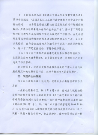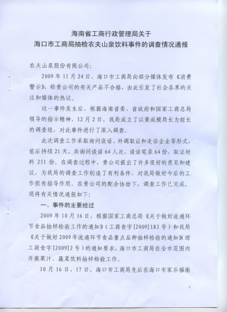 海口市工商局抽检农夫山泉饮料事件的调查一情况通报