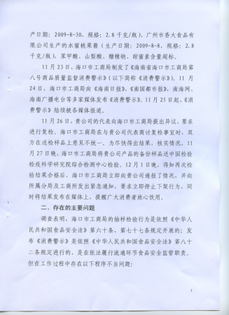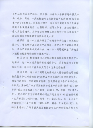 2009年11月30日:海口市工商局:将同批次样品送京复检