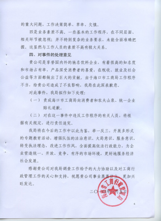 新浪财经讯 1月7日下午消息,农夫山泉“砒霜门事件”尘埃落定,新浪财经获得的由海南省工商局发给农夫山泉股份有限公司一份题为《海口市工商局抽检农夫山泉饮料事件的调查一情况通报》的函件中,海南省工商局用近三千字详述了砒霜门事件的来龙去脉及出错原因。以下为海南省工商局发给农夫山泉的函件: