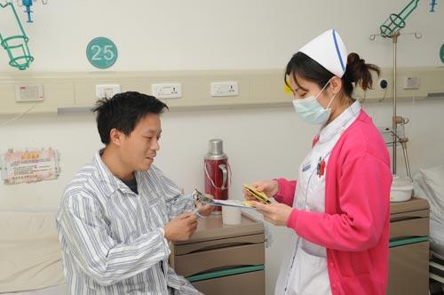 北京佑安医院的护士在为介入治疗期间的王建辉发药。张志远 摄