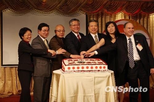 当地时间1月8日,美国东部地区最具影响力的华人电视媒体“美国中文电视”在纽约举行成立二十周年庆典,并向四位杰出华裔颁发了“二十年风云人物奖”。图为庆典现场主宾共同切开二十周年生日蛋糕。 中新社发 魏晞 摄