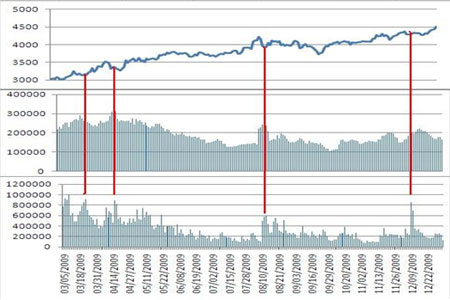 图3:美国原油期货09年价格、成交量和持仓量变化图