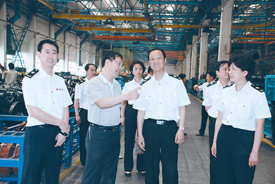 内蒙古检验检疫局局长周永生(右二)、副局长邢力(右一)、副局长孟传金(左一)考察重型汽车出口企业