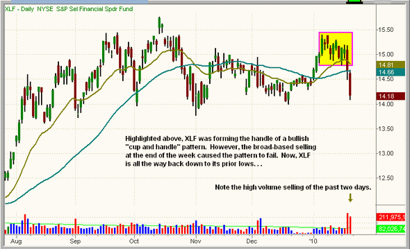 上周的暴跌走势令人担忧的一点是,即便那些具有相对强势的板块也出现了连续技术破位。相反,过去10个月来所有其他回调都是机构资金从一个板块轮动到另一个板块。在过去3天的暴跌开始之前,能源ETF表现出相对强势,在近期高点附近整理。但现在这些看涨形态全部被破坏了。类似地,上周刚开始时众多金融ETF形成“杯和杯柄”的看涨形态,现在这些形态也已经失效。下面我们通过S&P Energy SPDR(XLE)和S&P Financial SPDR(XLF)的图形来说明之: