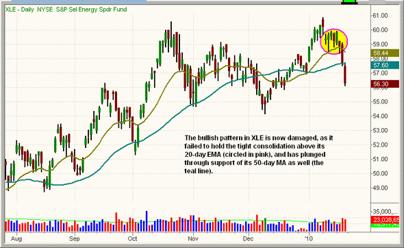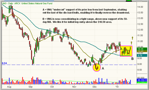 整个2009年UNG均处于稳定的下跌趋势,是去年表现最差的ETF之一。不过看起来UNG似乎已经见底了,有望逆转占主导的下跌趋势。我们喜欢UNG上个月月初“底切”2009年9月低点支撑的走势,这一走势将最后一批死多头震仓出局,一旦UNG开始走高,这些交易者很快将被迫重新入场。而且,50日均线的前期阻力现在已经变成了一个新的支撑位。如果UNG站上10.50美元,将触发我们的买入点。另外,交易者也可以考虑在UNG站上11美元之后再买入,不过我们相信,它突破短期整理区间高点的走势将把UNG迅速拉升至11美元上方。即便最终没能如此,我们也可以马上平仓并重新评估其技术形态。