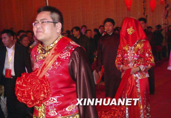 1月25日,新娘车晓和新郎李兆会手挽着手步入婚礼现场。新华社发(薛俊 摄)
