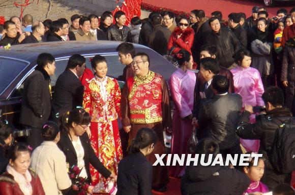 昨日上午,一对新人在海鑫集团厂区举行传统的“过门”仪式。在参加仪式前,所有宾客都要到厂区门口接受检查,凭请柬换取一枚胸章,然后乘礼宾车进入厂区。小姜形容,该婚礼的安保十分严密,“他们从北京请来100多个专业保安,有防暴装备,还有两只大警犬,进入厂区的人都要检查请柬的真伪,而且要过好几道安检关,不能带照相机、录像录音设备,不能用手机拍照。没有请柬和工作证都不许入场,大批媒体因此被挡在门外。同时媒体也不允许拍照,我拍了周边的一些图片都被他们没收了相机,后来经过交涉,删掉图片他们才把相机还给我。”同时,由于海鑫掌门人迎娶女明星的事在当地成了热门话题,厂区门口聚集了大批看热闹的老百姓。