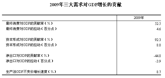 中国经济网北京2月3日讯 (记者何欣 刘鎏)本网综合报道,2月2日,国家统计局公布2009年三大需求(消费、投资和出口)对GDP增长的贡献,数据显示:2009年,最终消费对GDP的贡献率52.5%,拉动GDP4.6个百分点;资本形成(投资)对GDP的贡献率92.3%,拉动GDP8.0个百分点;净出口对GDP的贡献率-44.8%,拉动GDP-3.9个百分点。