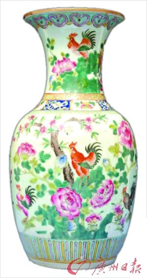 花瓶上的公鸡图案在当时的景德镇非常流行,也是后来广彩典型的“大吉图”。