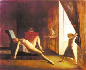 巴尔蒂斯(1908-2001)出生于法国巴黎的一个波兰贵族家庭,他在英国和瑞士度过青年时代。巴尔蒂斯虽然没有接受过正规的美术教育,但是他自幼就对艺术产生了浓厚兴趣,传统的古典主义绘画对他产生了深刻的影响。巴尔蒂斯依靠自学掌握绘画技法,先后受到博纳尔和库尔贝的影响。他从古代大师的作品中选择题材,将它们转换到现实生活中。巴尔蒂斯的绘画讲究柔和的色彩、细腻的笔触和精确的轮廓。巴尔蒂斯不属于任何艺术流派,造型基本属于现实主义范畴,情调颇具浪漫主义色彩,画面表现上呈现出超现实主义的某些印记。
