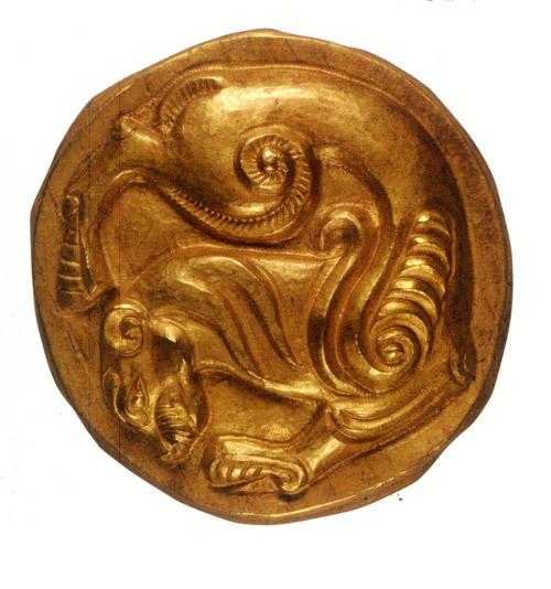 阿拉沟墓葬出土的金器量多,大小合计达200余件。大多是带饰、衣饰。虎纹圆牌八块,(上图)直径6厘米,重20克上下,图案中老虎躯体卷曲成半圆,极富动感。对虎纹金箔带四件,长26厘米,宽3.3厘米,重27.75克,呈长条形,是镶嵌于皮革上的装饰物,两虎相对,虎视眈眈。造型独特,工艺精细,显示出较高的工艺水平,学者们认为这是当地古代居民图腾崇拜的表现。动物纹是草原文化的主要特征,塞族人是新疆古老的游牧民族,喜欢佩戴狮子、老虎、狼等动物纹饰的装饰品,学者们称之为“野兽风格”。
