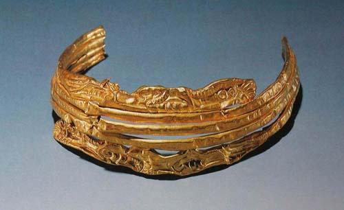 汉代吐鲁番的车师贵族也比较喜欢具有“野兽风格”的黄金饰品,1996年考古人员在吐鲁番市交河故城沟西墓葬中,发现的装饰虎纹的金冠(中图)、虎纹金戒指、牛头形金牌饰都反映了这种草原文化。