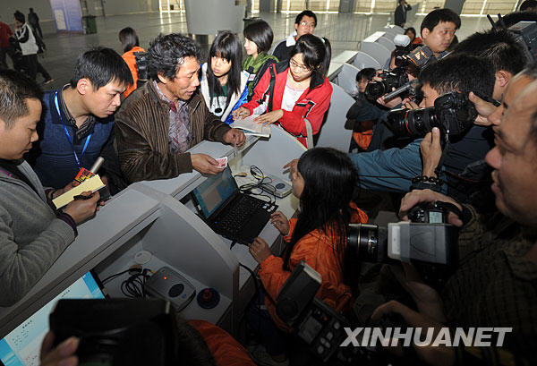 1月29日下午14时,在广州琶洲异地候乘点,湖南邵阳旅客唐结元(左三)持首张实名制火车票通过验证。当日,广铁开出的春运首趟广州至邵阳L7688次列车在琶洲异地候乘点验票候车。新华社记者刘大伟 摄