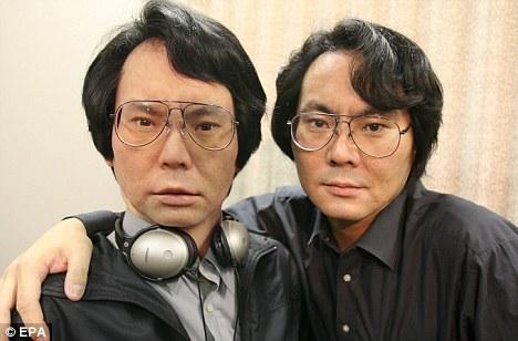 石黑浩教授和模拟自己的机器人在一起。