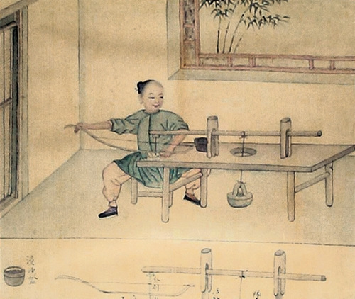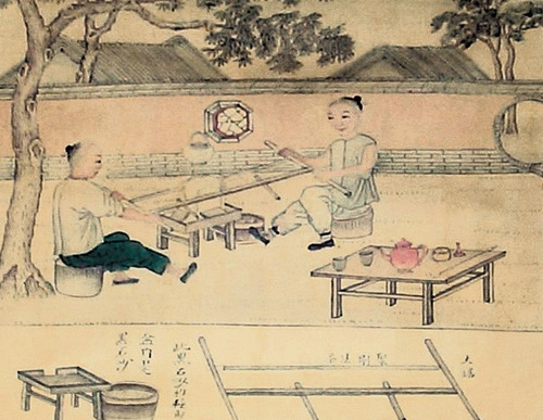 第二幅图名为《开玉图》,画的是如何将大的玉石分解。所用工具是弓子或锯,多用竹板弯成弓形,弓弦是用铁丝拧成麻花制成的。开玉的时候要在弦上不停地加解玉沙和水,慢慢地在玉石上磨,一点点将玉石“解开”。