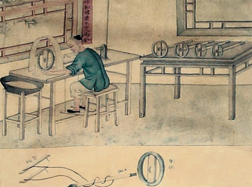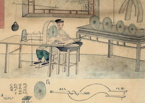 明代宋应星在《天工开物》中解释了制玉的工序:以解玉砂(金刚砂)与水搅拌,用可旋转的轮子带动盘和搅拌好的解玉砂把玉料抛开并慢慢琢磨成器。