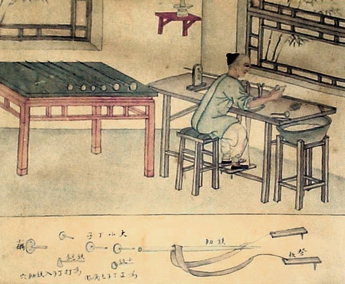 第十二幅图名为《皮砣图》,这也是抛光的程序,“皮砣”是用牛皮制成。