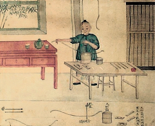 第八幅图名为《打钻图》,指钻孔,也是掏膛的准备工作。
