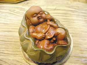 三五好友坐在一起喝茶,这茶宠还能逗人一笑。比如说,童子造型的茶宠,在浇上滚烫的热水时,会调皮地“尿尿”;张嘴憨笑的猪八戒,通体受热的时候就冷不丁从嘴里喷出水来。藏友丁文说,茶宠的“奥秘”是利用了中空结构。