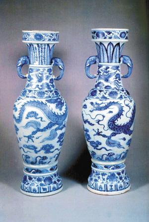 一个老者拿出一对元青花象耳瓶给我看,说是出土于江西景德镇,自报价值5000万元。如果是真品,我认为这个价格不止,可遗憾的是假的,“出土于景德镇”那也是编出来的故事。因为这两件东西和现藏于英国某大博物馆的“至正十一年”款的青花象耳瓶是一模一样,是照着人家仿制的。仿制者不知道这对在英国的瓶子的耳朵各有圆环,圆环太脆,都掉了,至今在原来套环的部分还有缺釉的痕迹。你拿给我看的东西既无环,又不缺釉,其他地方完全一样,不是仿制又能是什么呢?所以我认为,辨假识假,除了学问根底而外,就是要有丰富的阅历,看的要多。