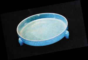 北京故宫博物院藏有“汝窑三足盘”,因为其中的一足折断了,就把另外两足去掉了一部分,让三足整齐,三足的足底又都分别打平,故宫博物馆出版的《图录》上就有这“短腿”的汝窑三足盘。造假者不知内幕,就按照《图录》上的“短腿”汝窑三足盘大批量地仿制,我在深圳就见过这样短腿的家伙不下几十件,件件相同。凡是见到这样短腿的家伙,我都定它为仿制品,你的“汝窑”怎么就这样巧:腿的尺寸跟人家的一样短,一样地断过一条腿后,把三腿打磨齐?
