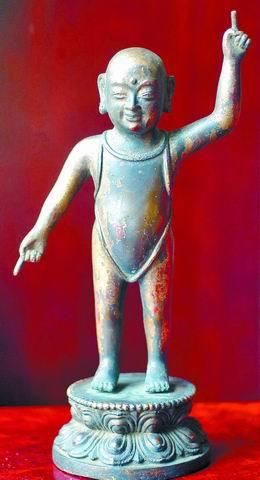 佛像见过不少,不过当天出现的一尊“小”佛像,却很是少见。这尊佛像超级可爱,不是宝相庄严的佛祖,也不是慈祥温婉的菩萨,却是一个嬉笑可爱的孩童——小神童。小神童仅穿一件肚兜,赤脚站立在莲花座上,左手指天,右手指地,通体刷金,面相却是典型的佛相,面容饱满,双耳奇大,眉心一颗痣。青铜器与钱币鉴定专家于倩老师说,小神童也是佛像的一种,寺院、民间都有供奉,小神童的动作叫做“指天画地”,表示天上地下无所不知,甚是有趣。这尊小神童像为民国时期的宝贝,于倩老师给出的市场价位为1万到1.5万元。