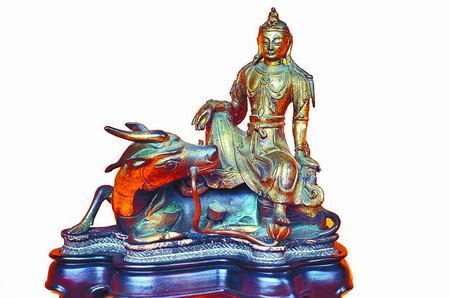 当天见到的另一尊佛像造型也很少见,这尊菩萨并不像通常所见的盘坐于莲花宝座上,而是骑在一头瑞兽背上。瑞兽造型奇特,似鹿非鹿,似马非马,还生有长须,须尾上生出一朵莲花、一个莲蓬,铸工非常精细。菩萨手持宝珠,面相庄严,丰肩细腰,璎珞披挂。于倩老师细看后说,这尊佛像为清代铸造,铜鎏金,菩萨是黄铜,瑞兽为青铜材质,做工精美,保存完好,给出的市场参考价为10万元。
