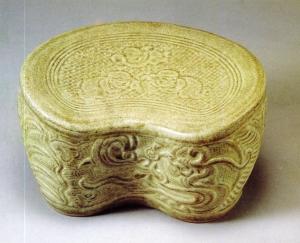 定窑在晚唐时期就在扬州崭露头角,北宋和金代进入了生产的极盛时期。扬州出土宋金时期的定窑器资料比较丰富,既有划花、刻花、印花和素面的白瓷器,也有黑釉(黑定)、酱釉(紫定)产品,印花鸳鸯戏荷纹盘、柳斗纹穿带扁壶都是北宋晚期的传世精品。白釉褐彩刻花六角枕的制作时代可早到北宋中期;而白釉印花小碗的产地是属于定窑系的山西霍窑。
