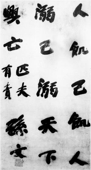 孙中山有幅书法作品(见下图),内容为:“人饥己饥,人溺己溺。天下兴亡,匹夫有责。”落款:孙文,钤印:孙中山印。“人饥已饥,人溺已溺”,出自《战国·孟子·离娄下》:“稷思天下粮缺,饥民无数,而感‘人饥己饥’。禹思天下水患,灾民万计,而感‘人溺己溺’。”见人饥饿或溺水,关怀他人疾苦,感同身受。“天下兴亡,匹夫有责”,则出自顾炎武之口,意为每个人都有责任思考天下兴亡之事。从中山先生的此幅墨迹来看,孙中山先生的书法作品不仅仅有博大豪迈、气势恢宏的榜书作品,也有儒雅、轻松、格调清新、韵味绵长的行书作品。他一惯喜欢写的字句是“天下为公”、“博爱”等有革命战斗性等词句赠予他人,希望与其同勉。就如此幅作品,浓墨重笔,有风樯阵马之势,展现孙中山时刻准备报效祖国,反映出先生忧国忧民、心系天下的博大胸怀。在孙中山与宋庆龄面临第一次生死离别,返回上海后,孙中山为宋庆龄题写了“精诚无间同忧乐,笃爱有缘共死生”的联句,韵味绵长的笔墨,展现出他们之间精诚无间的情感。两幅作品包含着不同的情感、诉说着不同的情怀,但在他的笔触间,还是可以认出其书法的来龙去脉,颜字的宽博与厚重仍清晰可见,潜移默化中服从于行书作品的整体风格。从中山先生大量的题字和墨迹中可以看出他早年在私塾中曾短期学习颜真卿“颜体”书法的痕迹,宽博厚重,中宫宽绰,四周紧密。大璞不雕、浑然天成的意境中,映射出中山先生其终生为之奋斗的崇高革命理想,更向我们展现了一个终生以革命、以救国救民为己任的政治家的豁达胸怀。